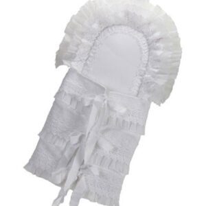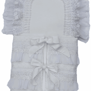 Taditional meets modern with this gorgeous number. With our vintage Claire lace over a gathered ruffle, this design adorns the entire front as well as around the full top portion to create a halo effect. This pooyah is finished with a side zipper for optimal child safety as well as a 3 bow front closure. Cotton Blend fabric. Colors: White