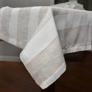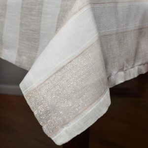 A two-tone wonder! This sheer vertically striped marvel with its metallic beige edged strip, is a room changer.