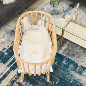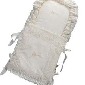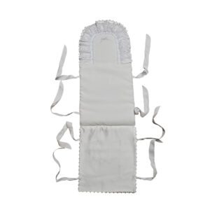 Our Joyce Pooyah has baby written all over it! With its gorgeous pique cotton blend fabric and stunning lace edging, it just gets better with an adorable embroidered bow on the pillow area and front center. With a choice of white and silver bow or ivory and gold bow embroidery, this piece is closed on the sides with 2 bows per side. Colors: White, Ivory